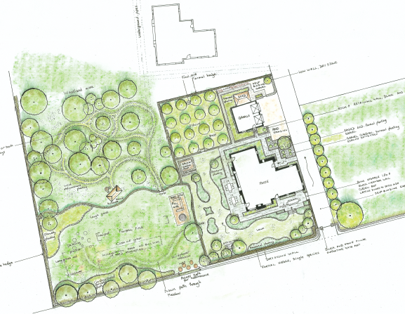 This brand new stone and render house for a young and growing family sits in farmland with distant views, but nothing to nestle it into the gradually sloping site. The land is a blank canvas needing shelter and a sense of enclosure, places to play and sit, and working areas. We are going to plant a woodland with paths for wandering, wild flower meadows, an orchard, a children's play area with climbing frames and football pitch, and a more traditional flower garden around the house, with places to sit and eat outside. The result will be views from indoors, places to sit in the sun or shade, wild walks and chances to encourage and spot pollinators and wildlife. With trees on the boundaries to nestle the house in its surroundings and bring shelter from wind, it will soon settle into the environment. It will be a phased build with paving, hedging and dry stone walling going in first, then other elements as the budget allows. I can't wait for it to start!